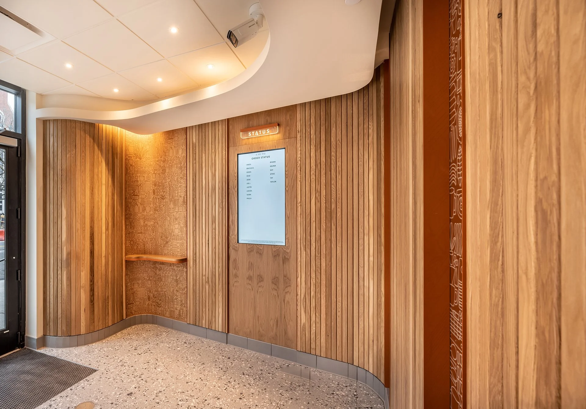 The OSU Pick Up store is the first licensed Starbucks Pick Up Only prototype. A warm, earthy palette with full‑height white oak walls, metal trims, and a Buckeye‑inspired custom Corian counter creates a focused, inviting environment that centers the pickup experience. The design balances curated materials and clear operational planning to support efficient service and a campus‑appropriate identity.